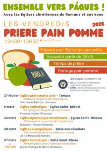 Temps de prière œcuménique suivi d’un temps de partage autour d’un morceau de pain et d’une pomme. Cette fois au temple de l’église protestante
